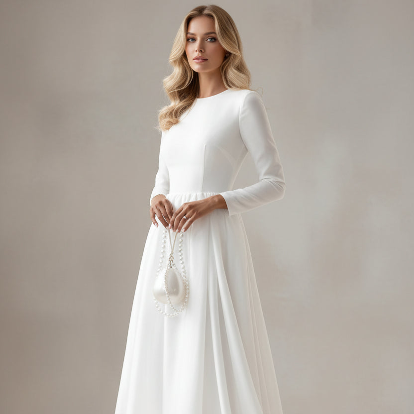 Crafted with carefully arranged faux pearls, this mini clutch features a structured silhouette and refined detailing. The compact size allows you to carry your essentials while maintaining a delicate, graceful appearance. It pairs beautifully with classic, vintage, and contemporary bridal styles.